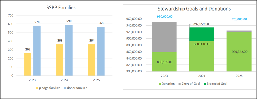 For the year ending 12/31/2025, stewardship received a total of $920,542 from 568 donor families. Compared to the same period last year, stewardship increased by $28,483 or just over 3%.